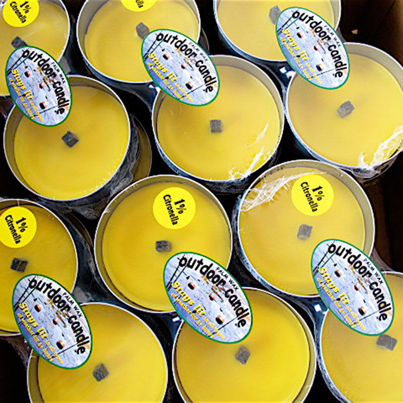 Windlflame® outdoor candles stay lit….unlike any other candles in the wind! Enhanced with 1% Real Java Citronella Oil provides wonderful citro scents, a scent those pesky mosquitos don’t like very much. Palm Wax Candles for the Windflame Metal holders, withstand brisk winds up to 25 mph yet may be extinguished in an instant with a snuffer. Windflame outdoor candles enchant with its large, vibrant, lively flame. Each candle burns 5 to 6 hours depending on the wind and may be used practically anywhere outdoors. No more fussing with dirty glass globes or cylinders. Simply light Windflame candles, set them out and enjoy them for hours. Windflame outdoor candles are impervious to weather conditions or climate, whether in winter snows, summer drizzles and the winds of spring and autumn. Windflame ‘windproof’ Candles are recommended for outdoor use only. Candles are designed to be used with Windflame Metal Candle Holders and should not be placed directly on wood surfaces or any surface that can be affected by heat. Candle tins can be floated in water just by themselves. See Photo.